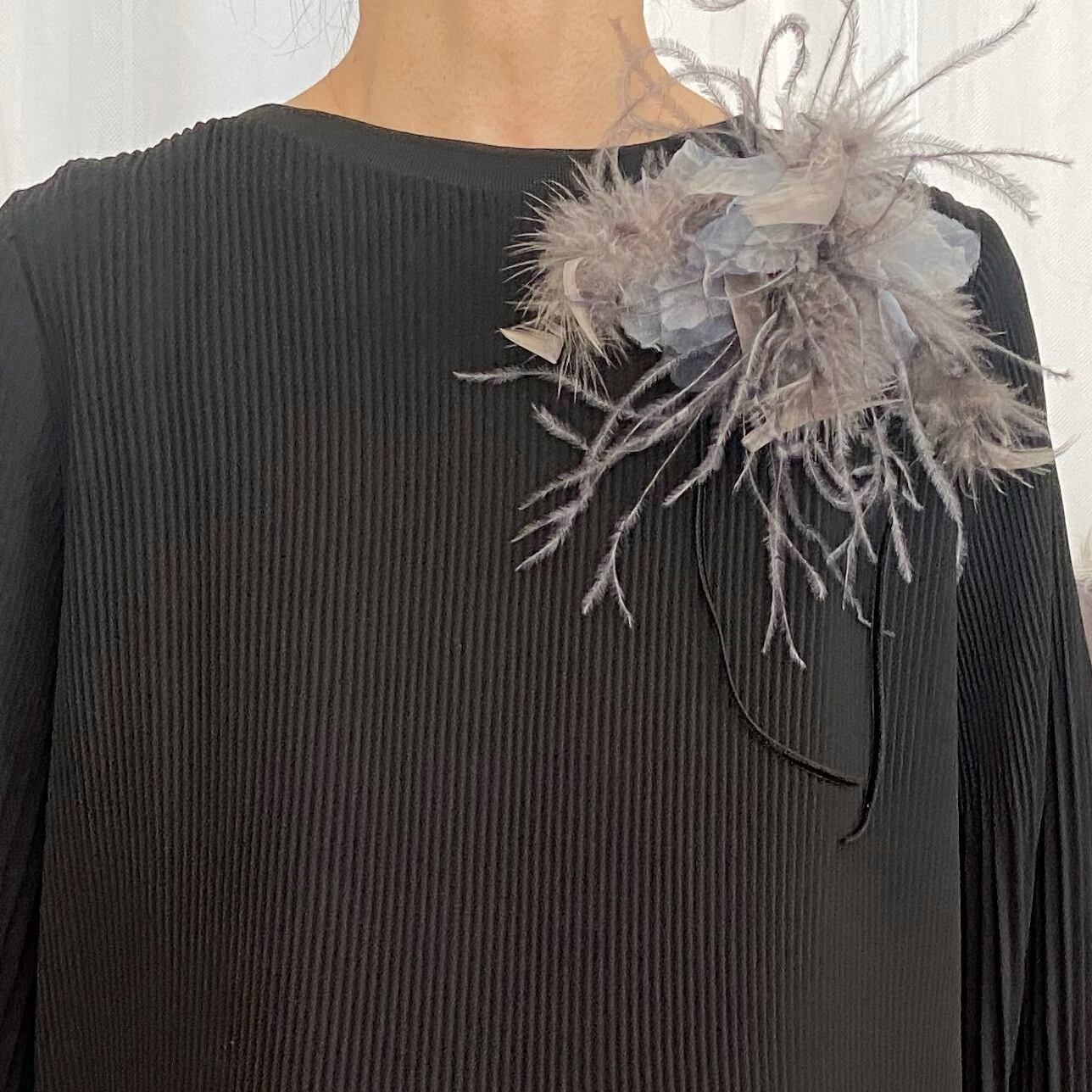 むら染めオーガンジー、オーストリッチ、鳥の羽を使用した異素材ミックスの大人可愛いデザイン☆