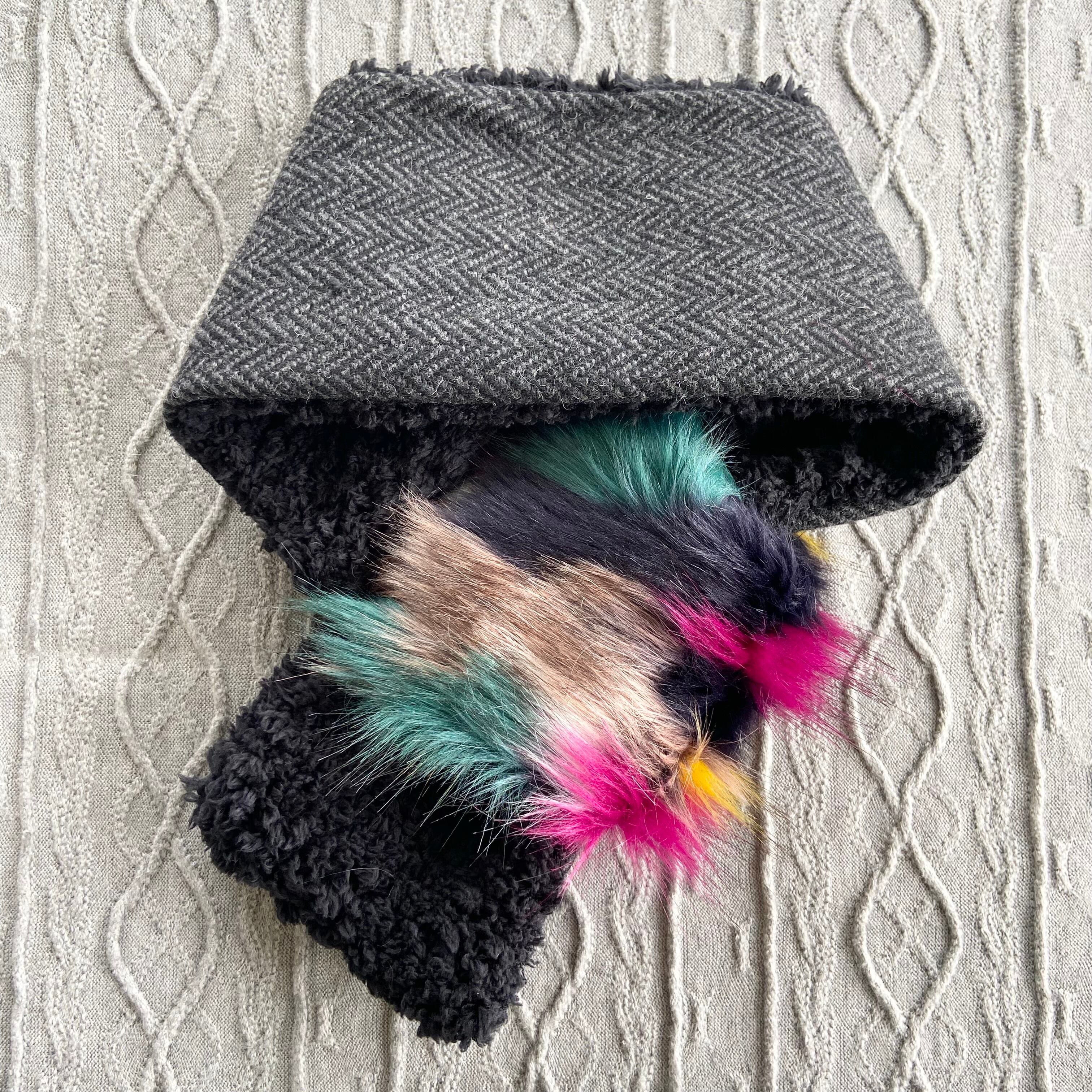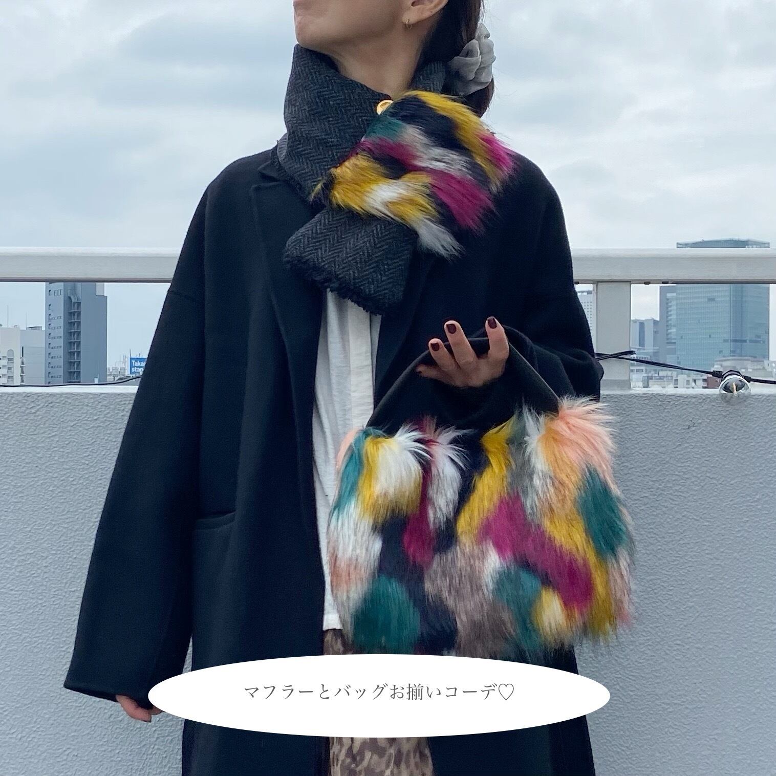 カラフルなカラーミックスのエコファーが可愛いアクセサリー感覚の大人カジュアルなコンパクトマフラーです