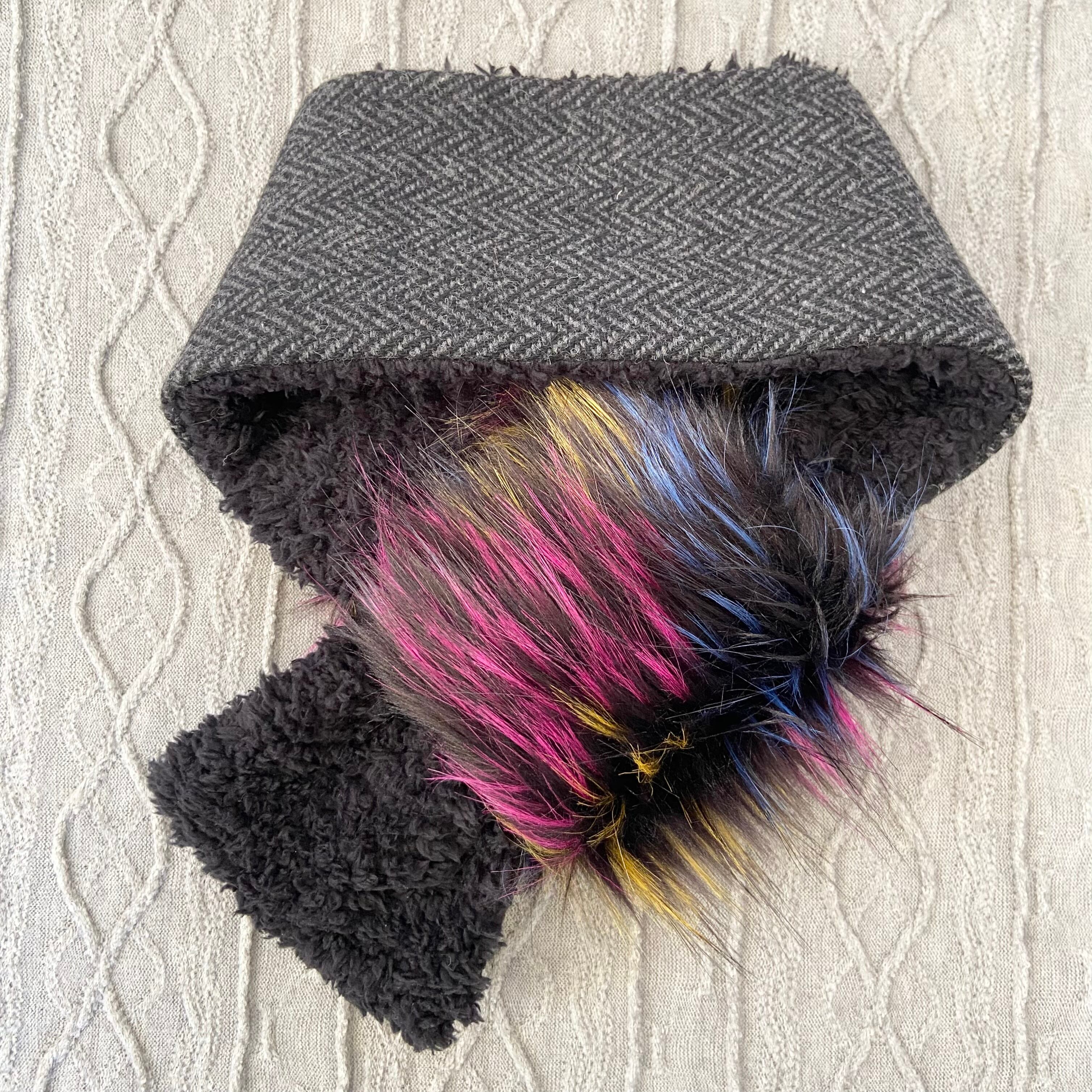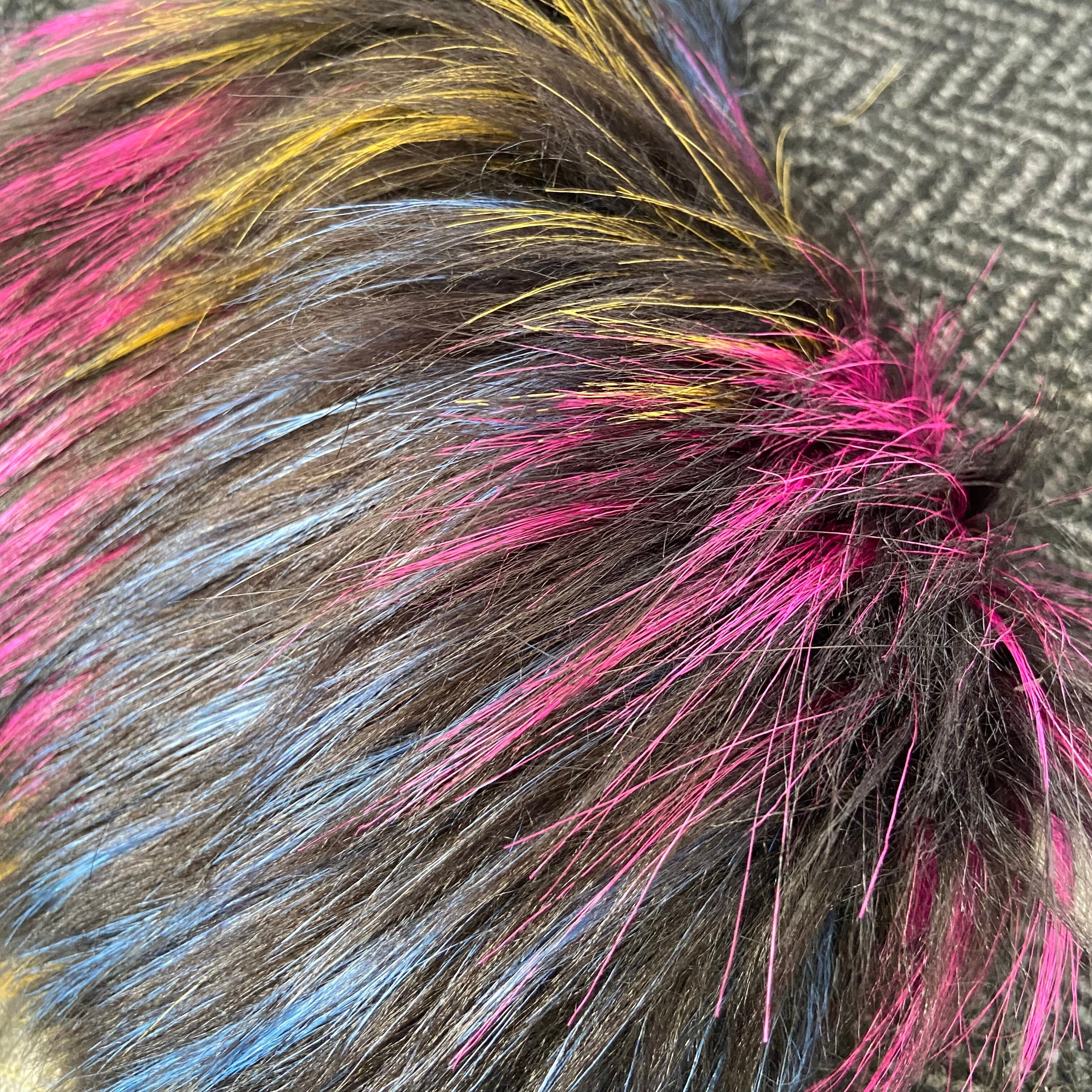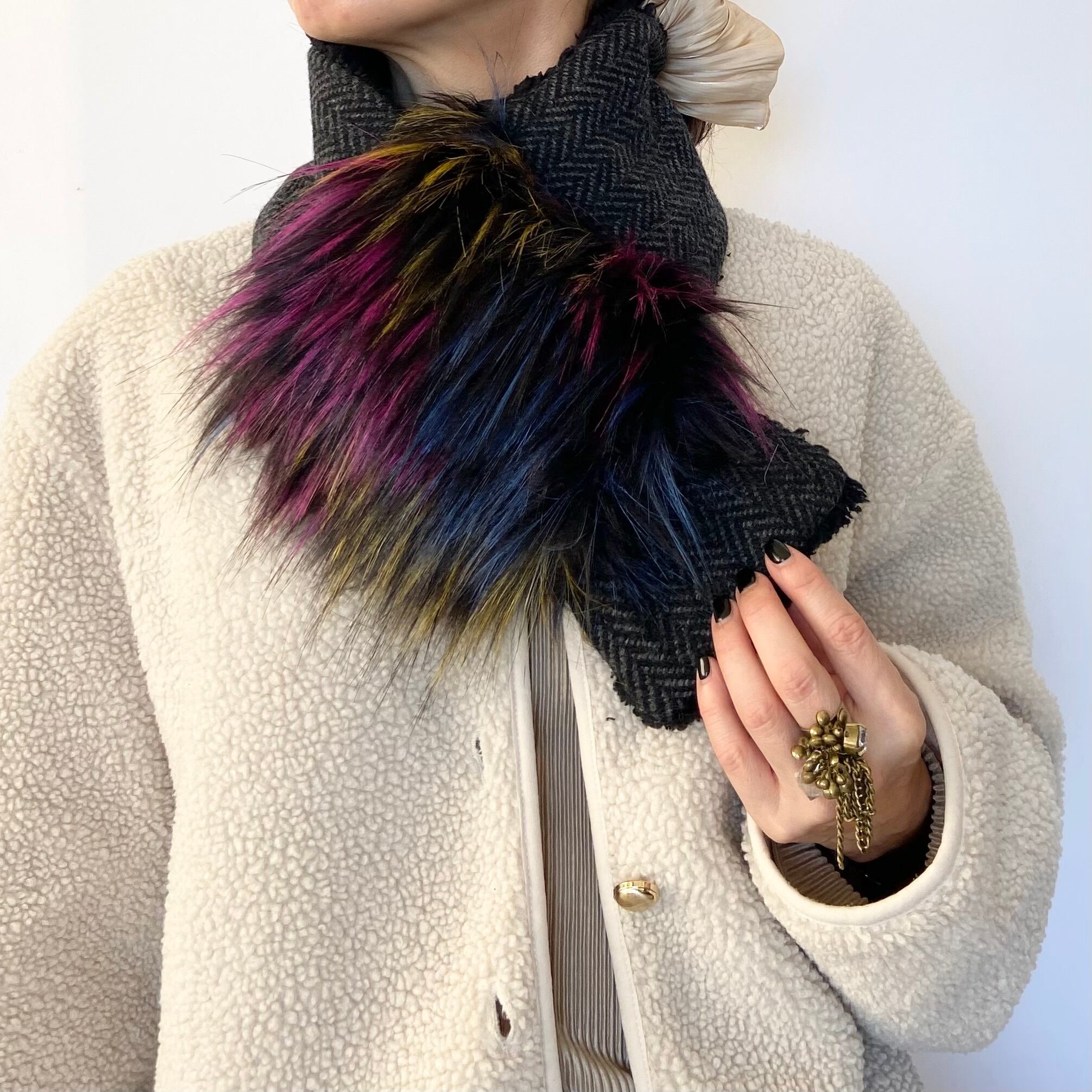 ブラックをベースにカラフルなカラーミックスのエコファーが可愛いアクセサリー感覚の大人カジュアルなコンパクトマフラーです