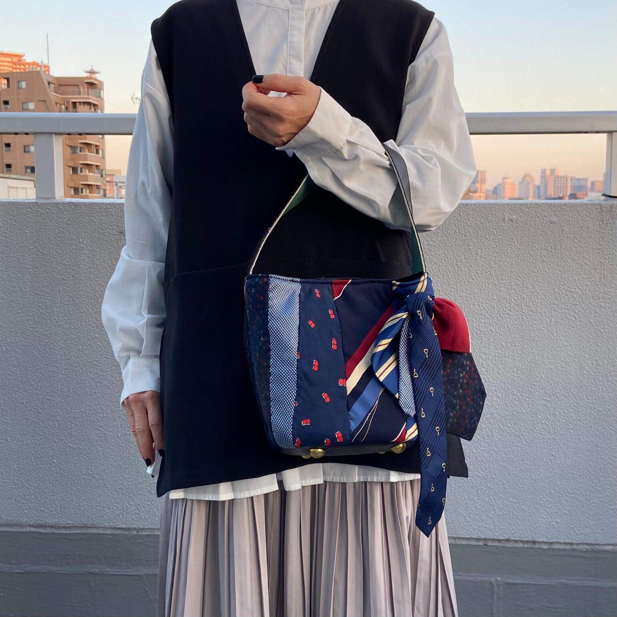カラーや柄の可愛いネクタイをあつめてパッチワークした1点もののバッグです。