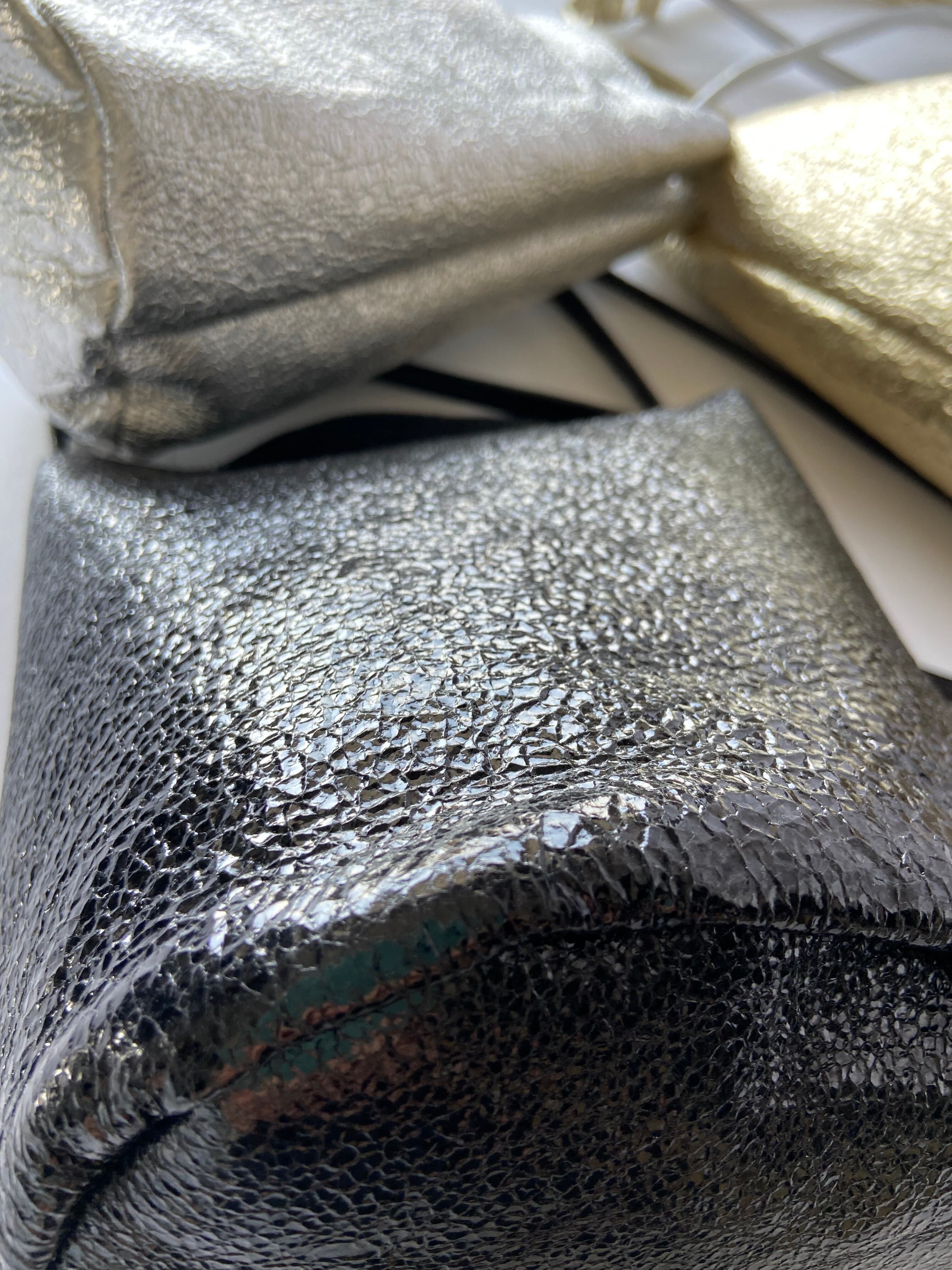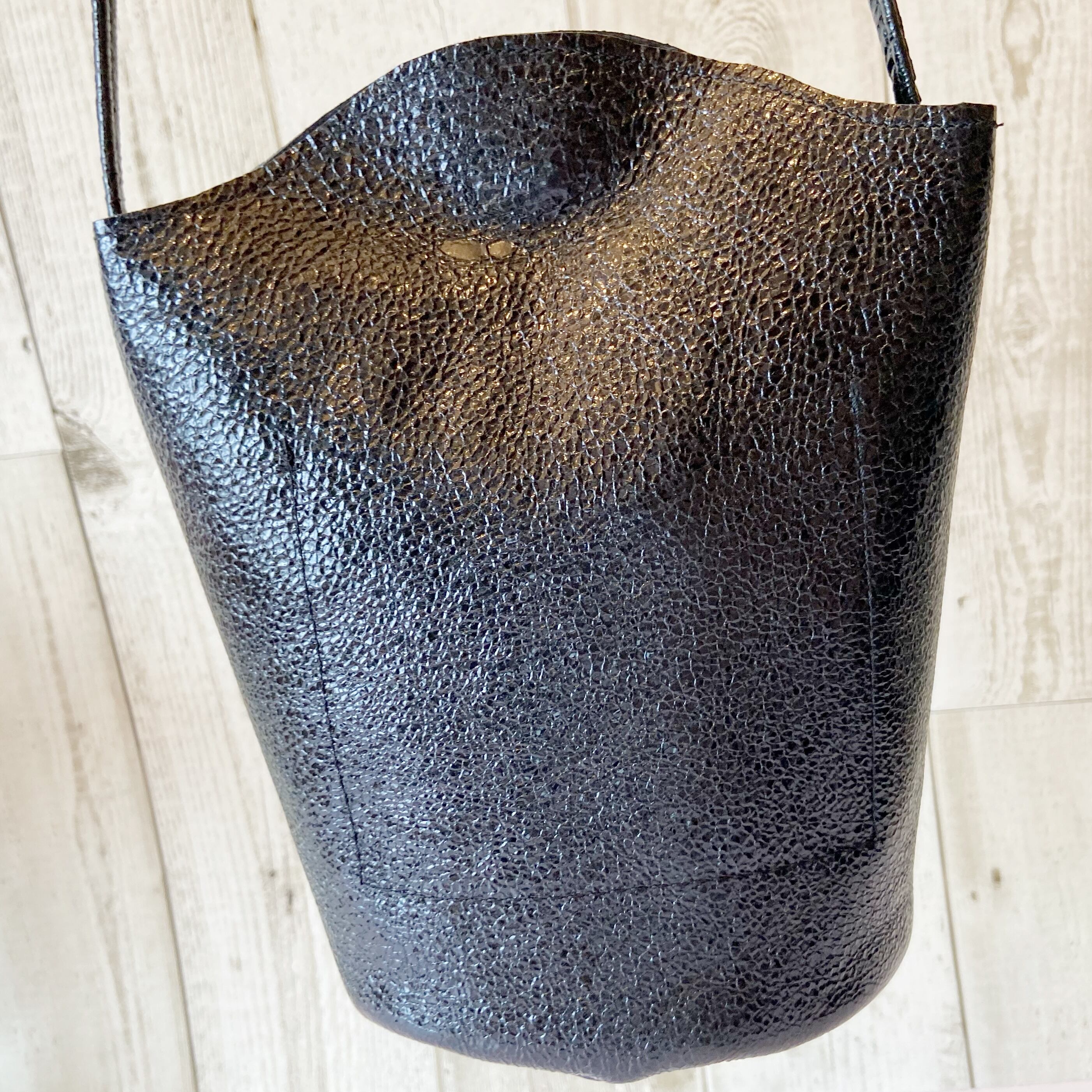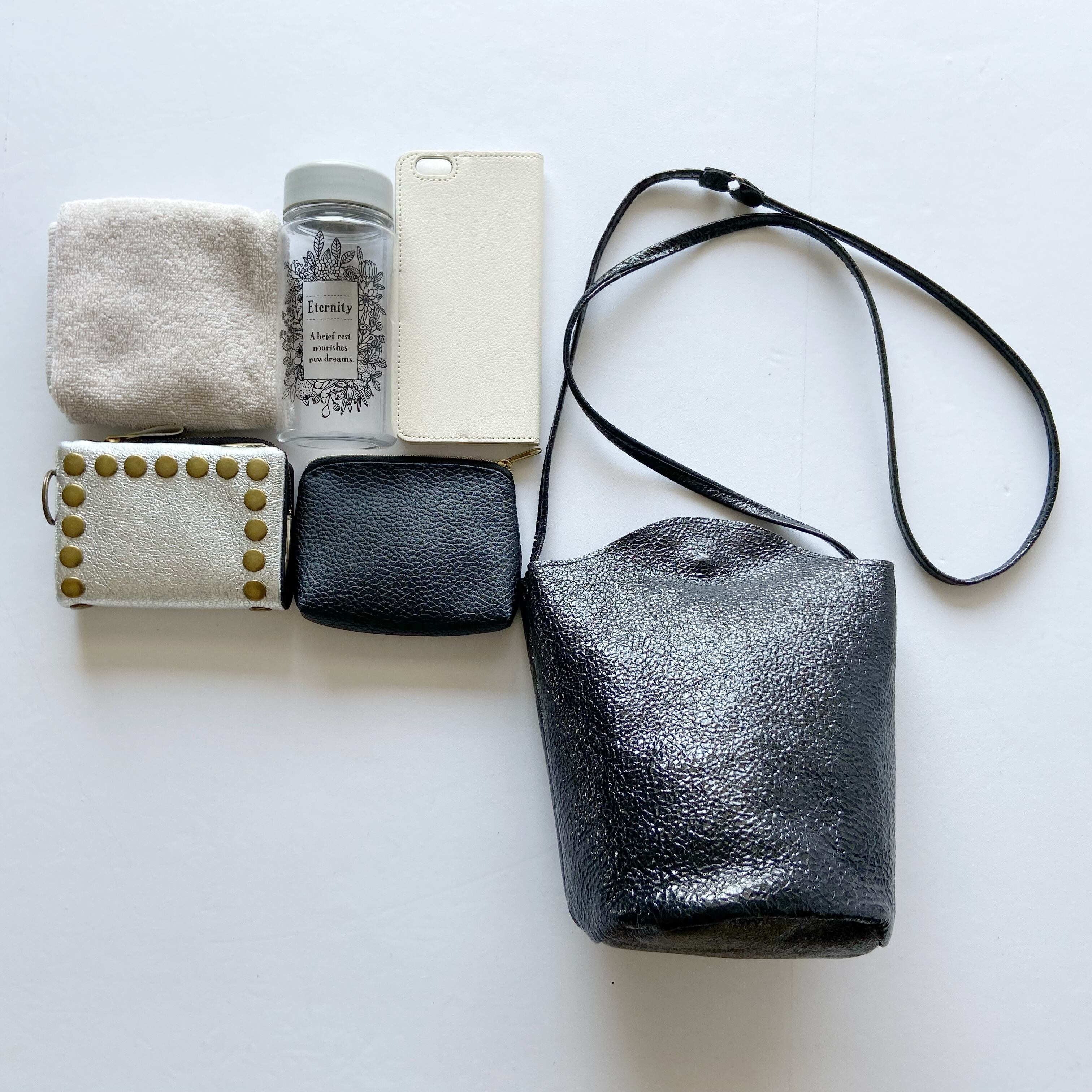 立体的でキラキラした独特の表面感のピッグレザーを一枚仕立てで作ったとても軽いポシェットです。