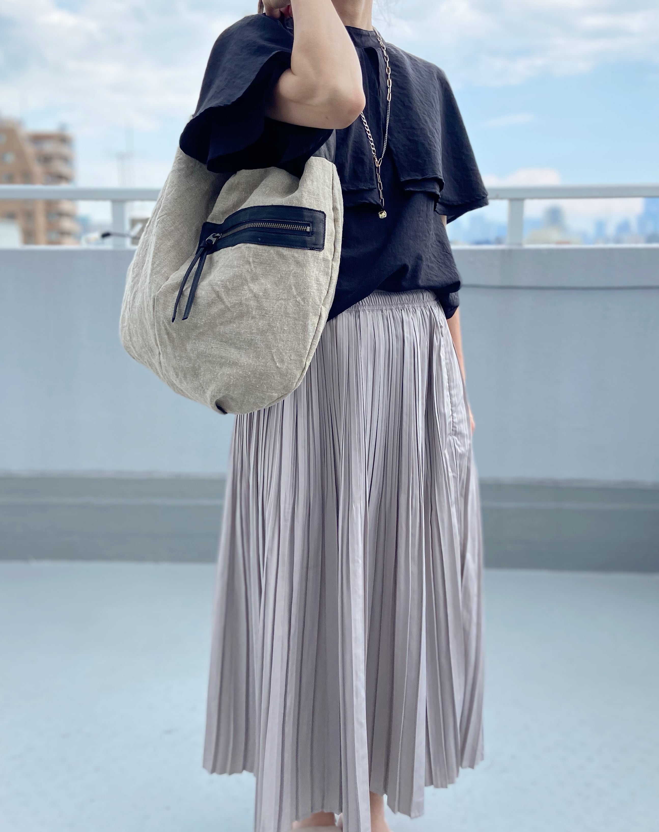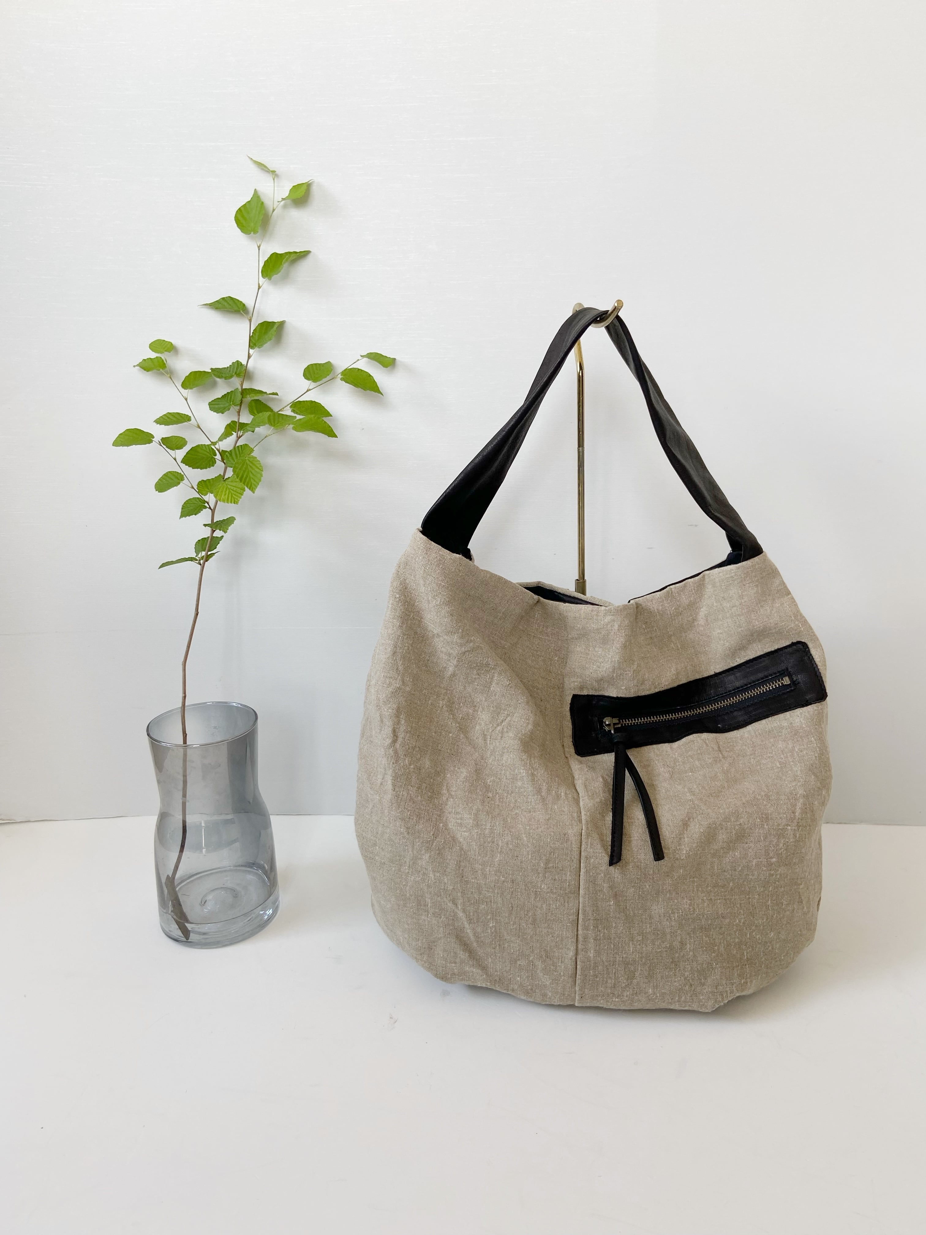 ●ナチュラルなリネンにブラックの馬革コンビでカッコよく引き締めてくれます。