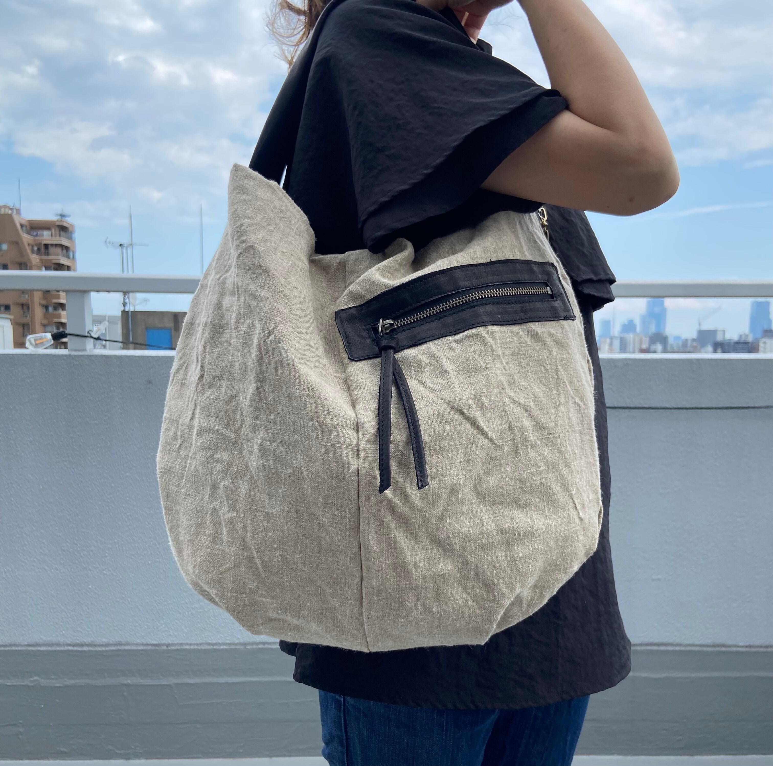 ミリタリーリネン&ホースレザー*ソフトで軽い大きめショルダーバッグ*A4収納可*オプションで斜め掛けに変更可能