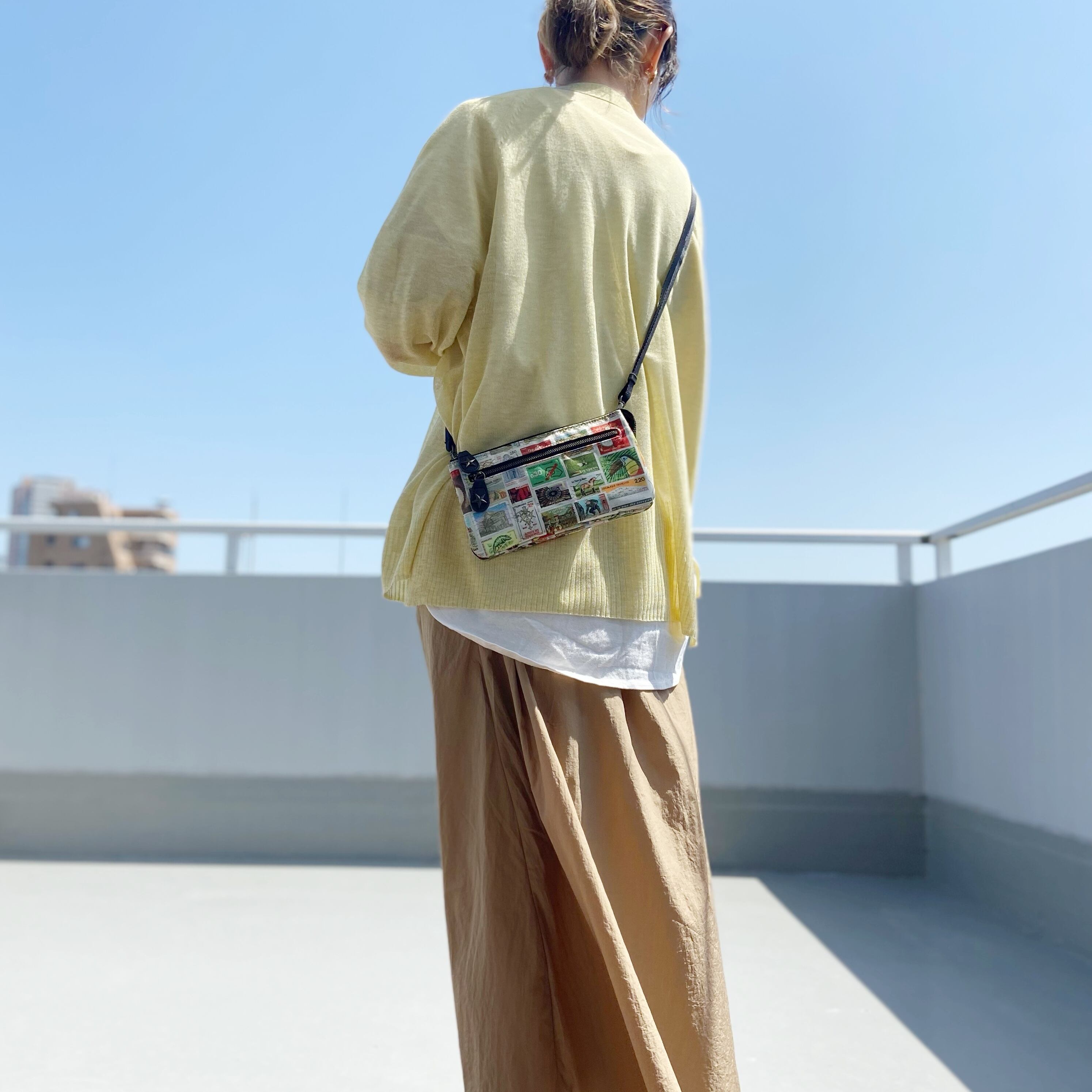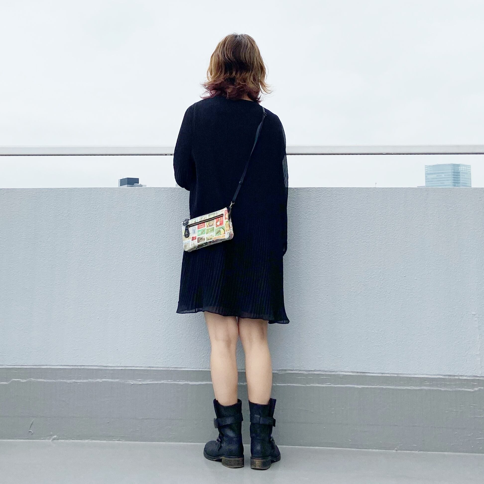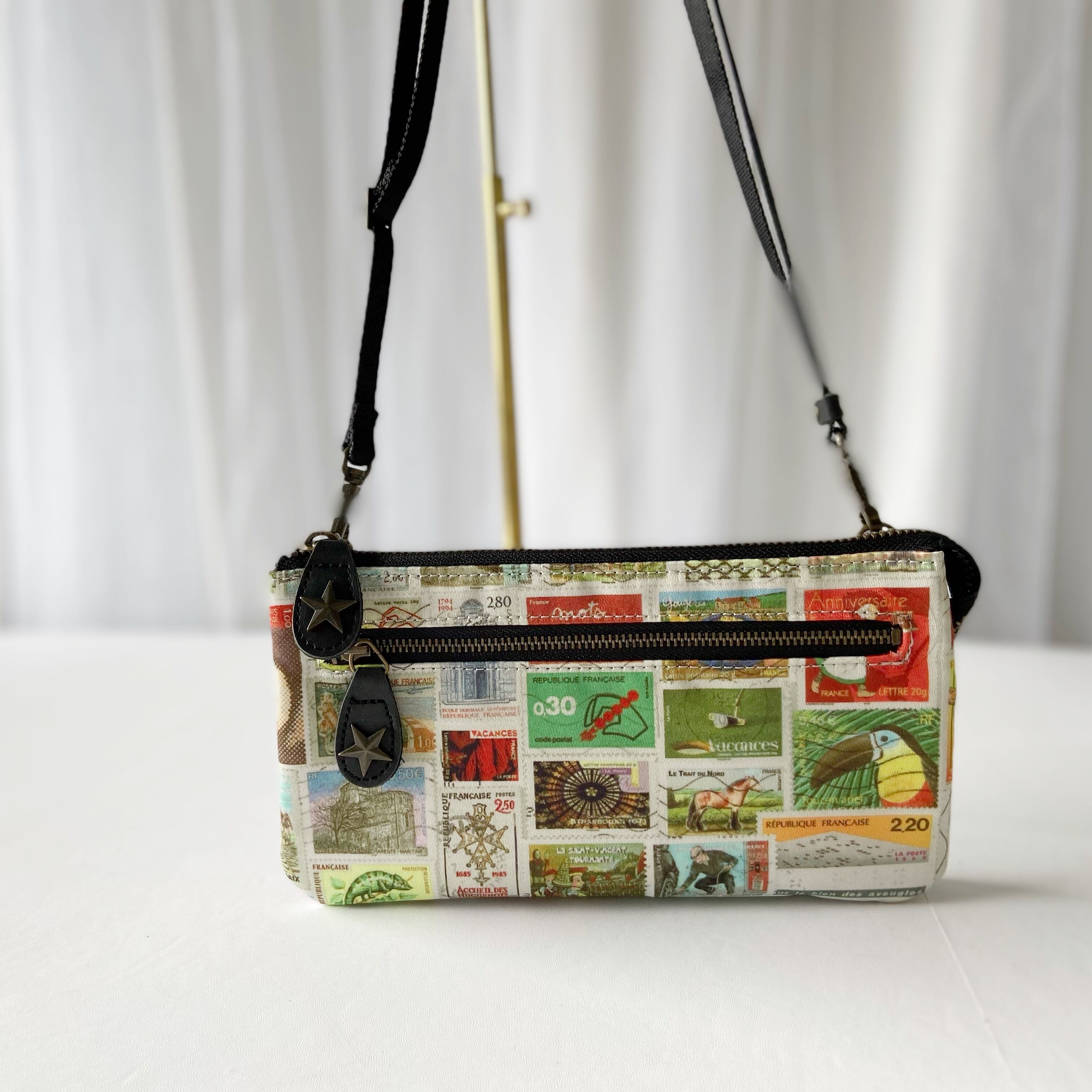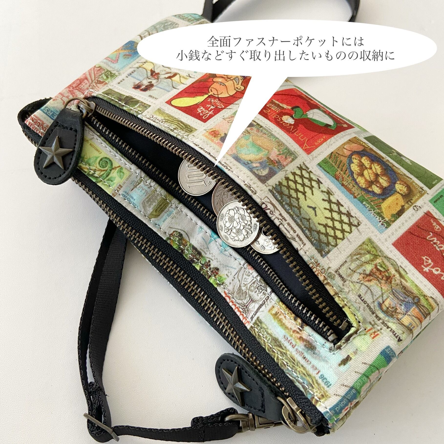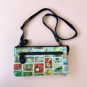 財布ポシェット*ヨーロッパヴィンテージ切手プリント*本革コンビ*ショルダー取り外し可能
