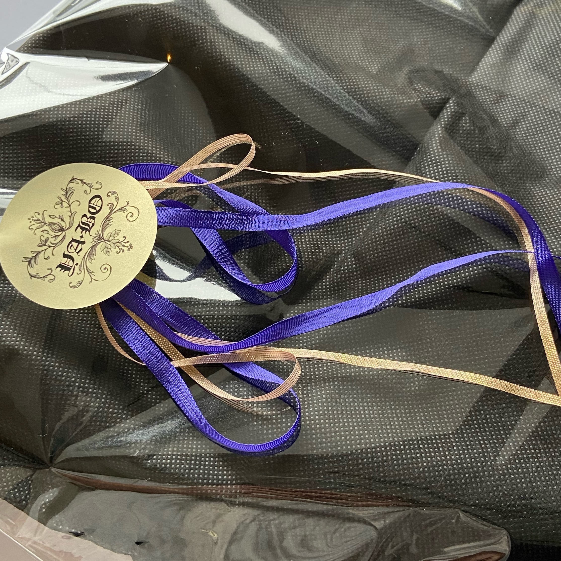 ブラックの不織布袋に入れてからクリアPP袋に入れてラッピングしてあります。