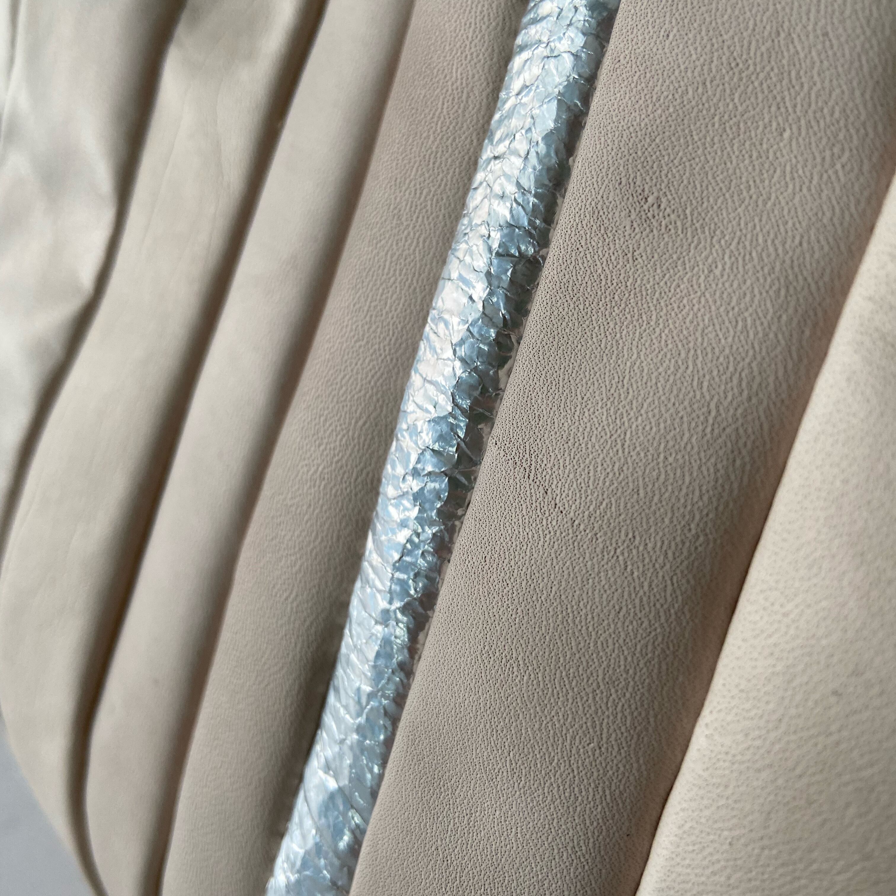 ランダムなストライプにパッチワークしてあり、ラインで入ったキラキラしたシルバーの革がカッコよく、スタイルにメリハリをつけてくれます。