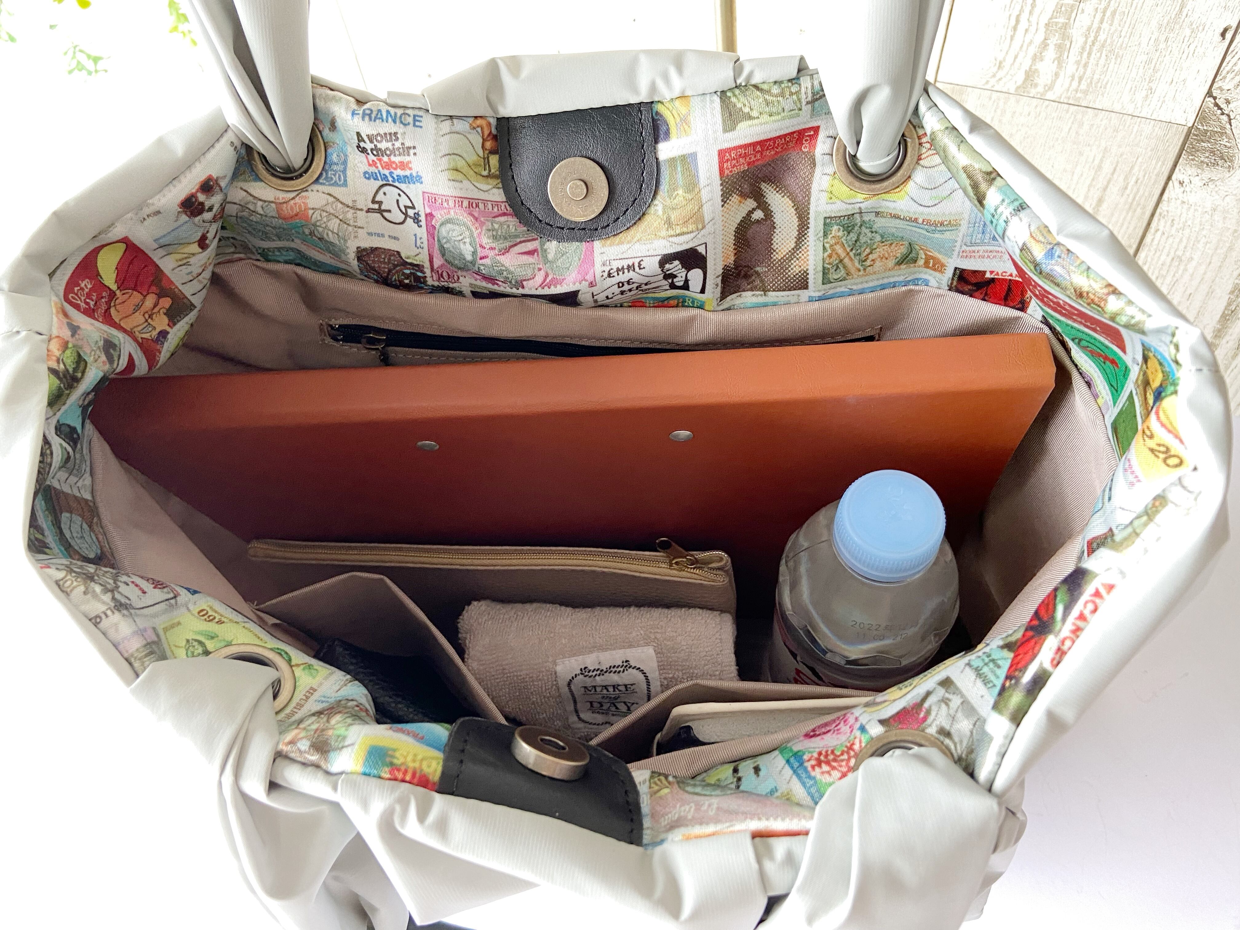 内側の口元にはヨーロッパのヴィンテージの切手をプリントしたオリジナルの生地 がチラッと見えてカッコ良くお洒落☆彡