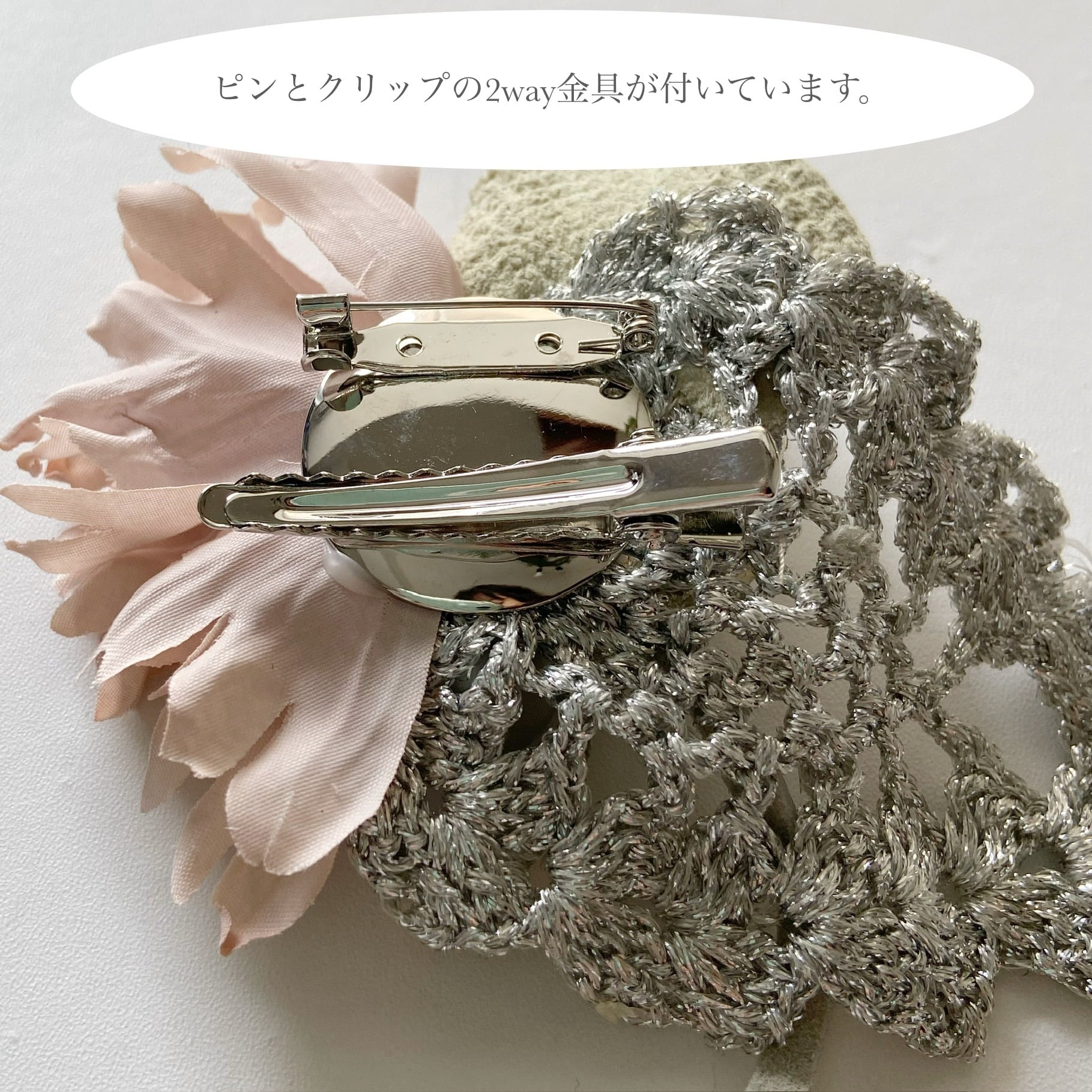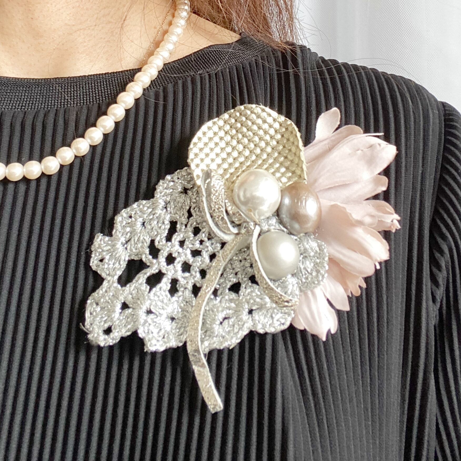 柔らかなさくらピンクカラーのアーティシャルフラワーとシルバーラメの手編みリーフ、シルバーの型押し革、形、質感の違うパールなどふんだんに使った1点もののコサージュです。