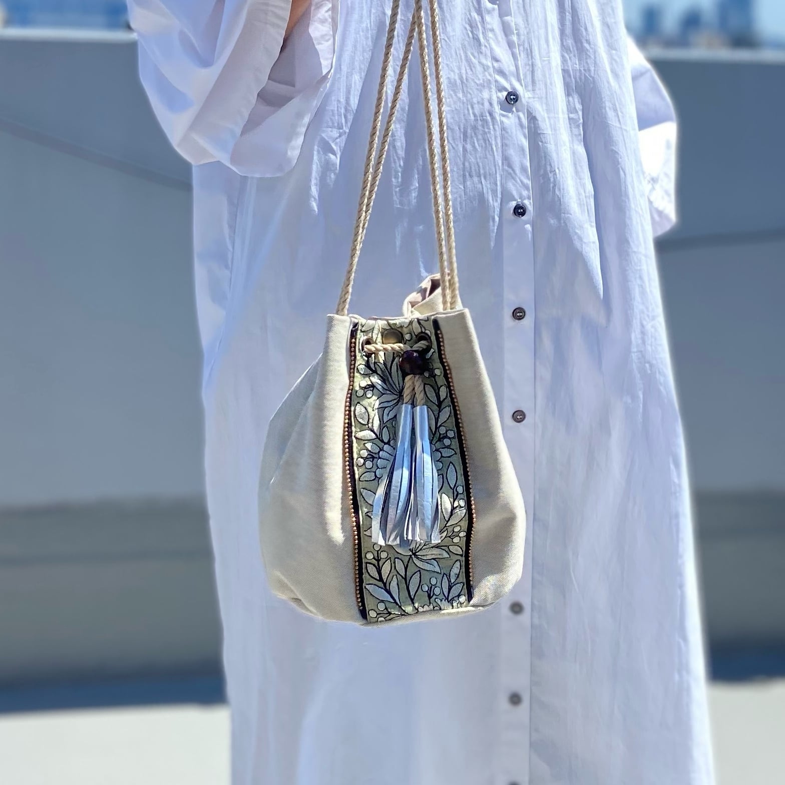 ミントカラーの綺麗なインド刺繍リボンをポイントにした巾着バッグです。