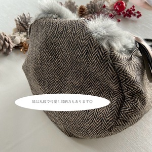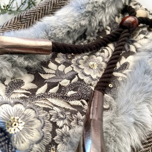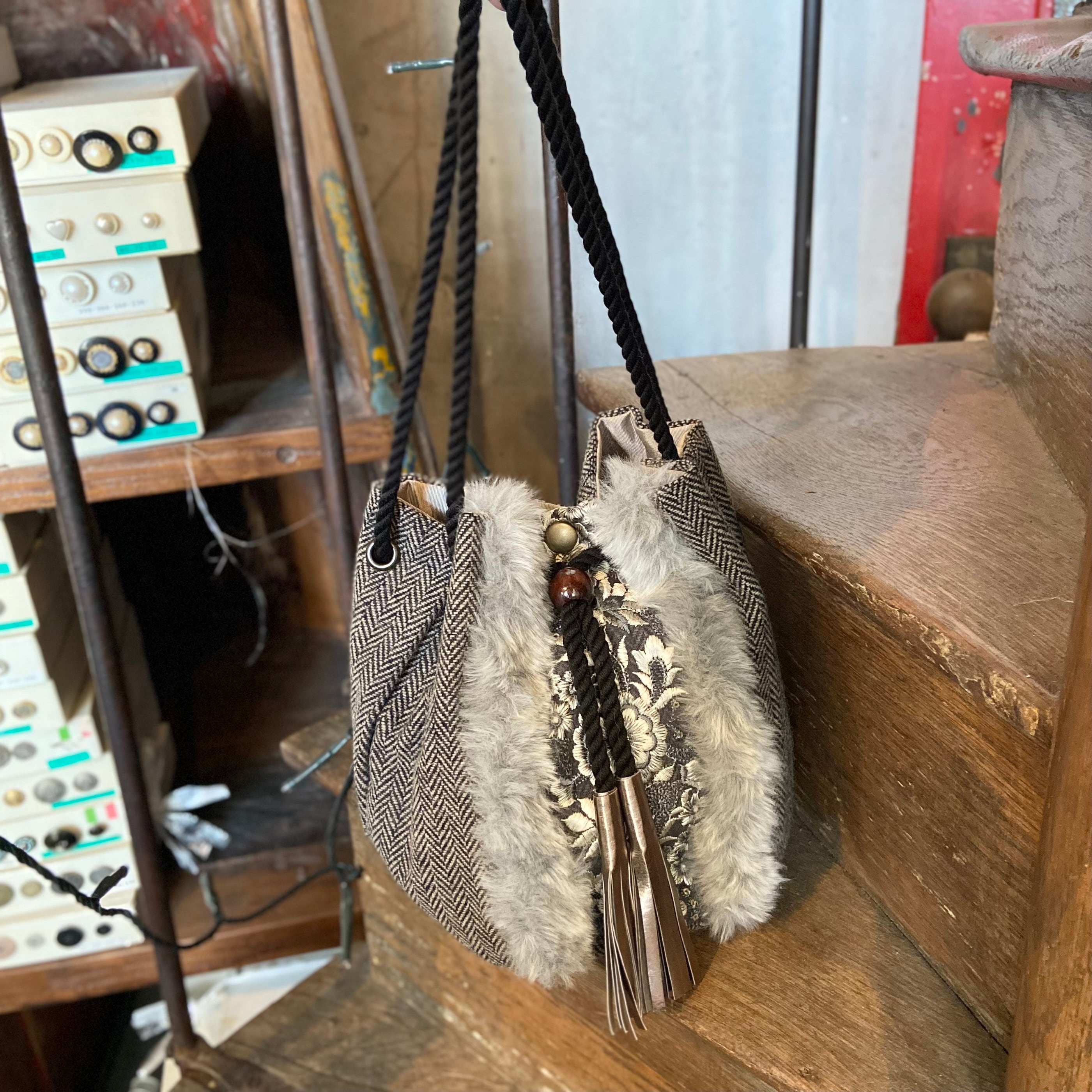 【数量限定】ヘリンボーン生地×インド刺繍リボン巾着*ファー*てさげ*斜めがけ*2WAY斜めがけ*軽量*