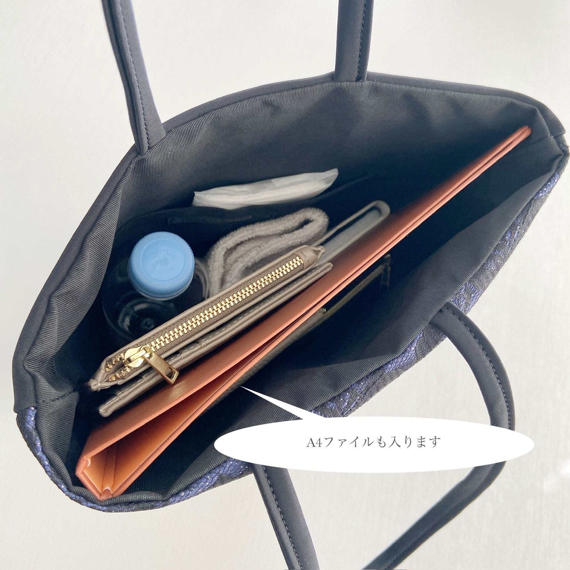 ●A4サイズファイルやスリッパ、その他ちょっとした荷物も入るサイズ感なので、学校の保護者会や集まり事などにも使えます。