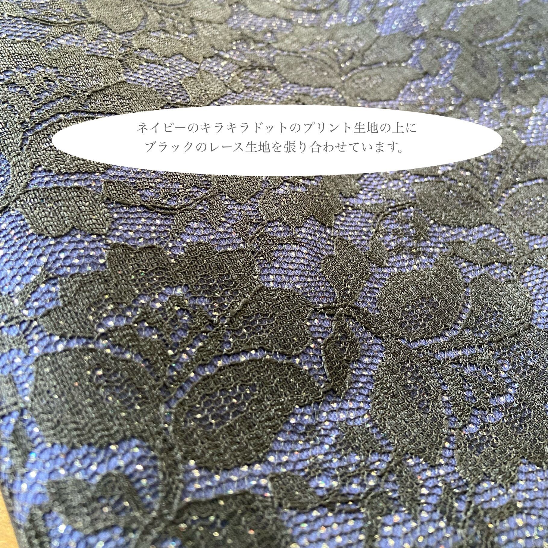 ●ネイビーのラメプリントベースでその上にブラックレースを貼り合わせてあり、ブラックのお洋服にもネイビーにも合わせやすいです。